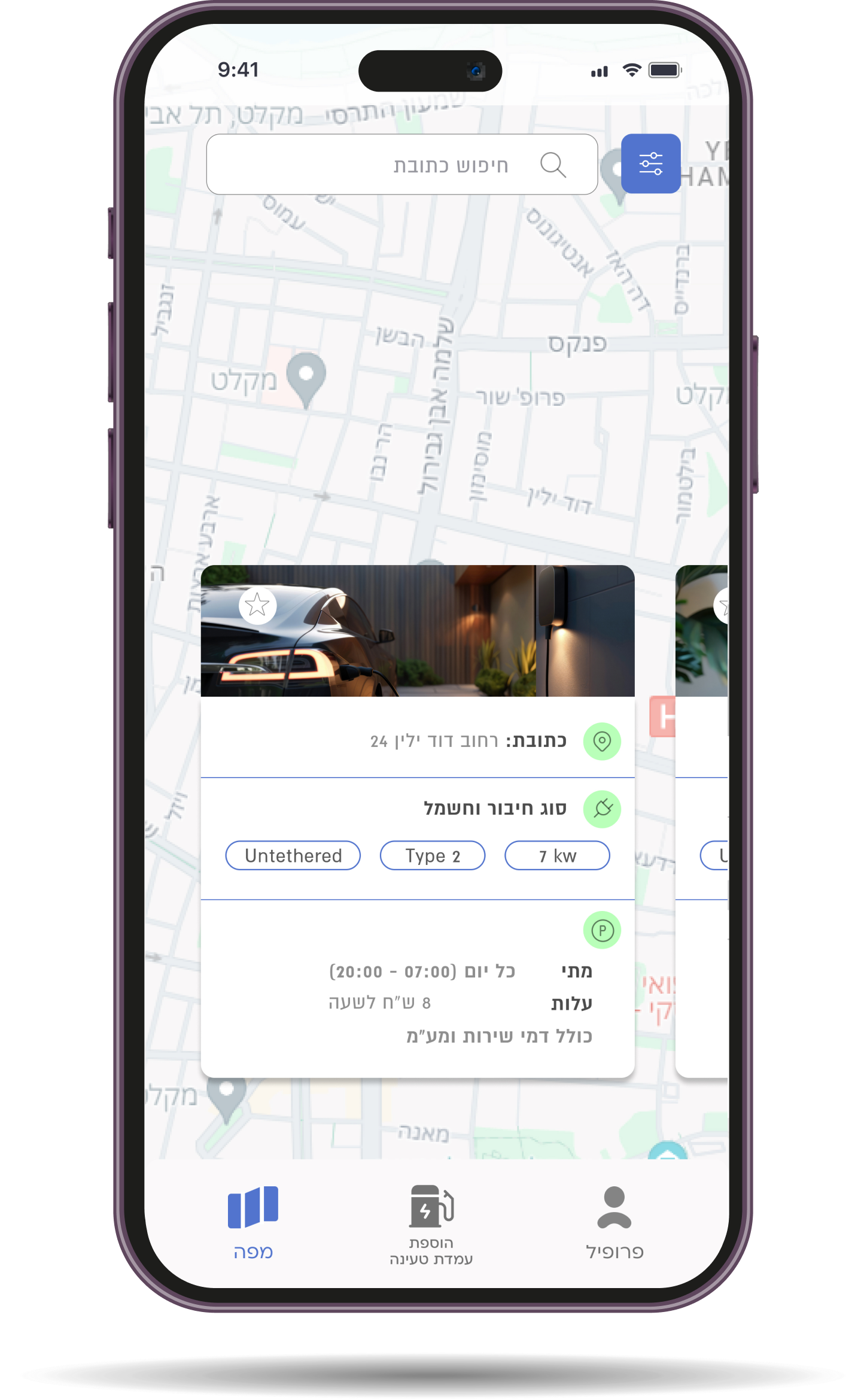 לחפש עמדות טעינה לפי מיקום, סוג חיבור וזמינות.